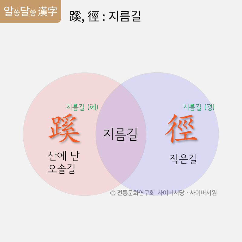 蹊, 徑 지름길 1) 蹊 : 蹊(혜)는 《爾雅》 〈釋名〉에, “步所用道曰 蹊 (보소용도왈 혜)(걸어 다니는 길을 蹊라고 한다.)”고 하였는데 徑(경)보다 작은 길로 밟아서 생긴 작은 길로 山間(산간)에 난 오솔길을 뜻한다. 蹊(혜)는 뜻을 결정한 足(발 족)과 발음을 결정한 奚(어찌 해)가 합쳐졌다. → 《史記》 〈李將軍列傳〉 桃李不言 下自成蹊 - 《사기》 〈리장군열전〉 도리불언 하자성혜(북숭아나무와 오얏나무는 말은 하지 않지만 그 아래로 절로 길이 난다.) 2) 徑 : 徑(경)는 《說文解字》에, “徑 步道也 (경 보도야)(徑은 걸어 다니는 길이다.)”라고 하였다. 徑(경)은 작은 길이라는 뜻으로만 쓰일 뿐 동사로 ‘밟다’는 뜻으로는 쓰이지 않는다. 徑(경)은 곧게[巠] 갈 수 있는 길[彳]을 이른다. → 《周易》 〈說卦傳〉 艮爲山 爲徑路 爲小石 - 《주역》 〈설괘전〉 간위산 위경로 위소석(艮은 산이 되고 작은 길이 되며 작은 돌이 된다.) 글 박상수(단국대 강사, 전통문화연구회 연구위원)