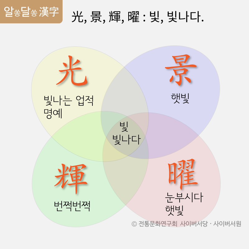 光, 景, 輝, 曜 빛, 빛나다 1) 光 : 光은 《說文解字》에 ‘光 明也 (光은 밝음이다.)’라고 하였다. 光은 사람이[儿] 불을[火] 들고 있는 모습을 본뜬 글자로, 처음에는 불빛[火光]의 의미로 쓰이다가 그 뜻이 확장되어 물건의 빛나는 것으로까지 분화되었다. 이후 발광체에서 나는 빛뿐 아니라, 빛나는 업적이나 아름다운 덕을 이르는 榮光의 경우처럼 영예로움을 이르는 말에도 쓰이게 되었다. → 《詩經》 〈齊風·鷄鳴〉 匪東方則明 月出之光 (동쪽이 밝아 오는 것이 아니라 달빛이 비치는 것이겠지.) 2) 景 : 景은 《說文解字》에 ‘景 日光也 (景은 햇빛이다.)’라고 하였다. 光이 불빛에서 발생하는 ‘빛’을 말한다면 景은 햇빛의 ‘빛’을 이른다. 景은 높이[京] 떠 있는 태양[日]에서 나는 빛을 이른다. 때문에 고대에는 햇빛이 비치면 그림자가 생기는 것은 당연하다고 생각했기 때문에 ‘影’과 같은 의미로 쓰였다. → 《荀子》 〈富國〉 ‘三德者誠乎上 則下應之如景[影]嚮 (세 덕이 위에서 진실해지면 아래에는 그림자나 메아리처럼 호응한다.) 3) 輝 : 輝는 《說文解字》에 ‘輝 光也 (輝는 빛나다.)’라고 하였다. 輝는 군대에서[軍] 한밤중에 불을[火] 밝혀 놓은 상황을 이른다. 輝는 光과 의미가 비슷하지만 ‘번쩍번쩍’ 불이 빛나는 모양을 본뜬 형용사로 주로 쓰인다. → 《漢書》 〈李尋傳〉 夫日者 衆陽之長 輝光所燭 萬里同晷 人君之表也 (태양은 뭇 양기의 으뜸으로 찬란한 빛이 비치는 만리까지 다 함께 밝으니 이는 인군의 표상이다.) 4) 曜 : 曜는 《釋名》 〈釋天〉에 ‘曜 輝也 光明照輝也 (曜는 빛나는 것이다. 빛이 밝게 비치어 빛나는 것이다.)’라고 하였다. 曜는 날아가는 꿩의 깃이[翟] 햇빛을[日] 받아 반짝이는 상황을 이른다. 처음에는 불이나 전기 등에서 강하게 번쩍이는 빛을 모두 이르는 말이었으나 이후 명사화 되어 눈을 부시게 하는 빛이라는 의미로 쓰이기 되었다. 景이 景物의 의미로 그 뜻이 파생되어 쓰이게 되자 曜가 점점 햇빛의 의미로 쓰이게 되었다. 때문에 태양신을 요령(曜靈)이라고 한다. → 〈岳陽樓記〉 日星隱曜 山岳潛形 (해와 별이 빛을 감추자 산악이 모습을 숨겼다.) 글 박상수(단국대 강사, 전통문화연구회 연구위원)