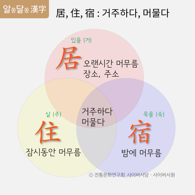 居, 住, 宿 거주하다, 머무르다 1) 居 : 비교적 오랜 시간을 머무는 것을 이른다. 때문에 명사로 사용될 경우 거주하는 장소, 주소 등을 나타낸다. → 《荀子》 〈勸學〉 君子居必擇鄕 游必就士 - 《순자》 〈권학〉 군자거필택향 유필취사(군자는 거처함에 반드시 마을을 가리고 사귈 때는 반드시 선비에게 나아간다.) 2) 住 : 비교적 뒤에 만들어진 글자로 고대에는 ‘머물다[止]’의 뜻으로 해석이 되었으며 어떠한 일을 진행하다가 잠시 머물고 있는 상태를 이른다. 居(거)와 住(주)를 비교하면 居(거)는 정착, 住(주)는 잠시 동안의 거주를 이른다. → 《列子》 〈楊朱〉 賓客在庭者日百住 庖廚之下 不絕煙火 堂廡之上 不絕聲樂 - 《열자》 〈양주〉 빈객재정자일백주 포주지하 불절연화 당무지상 불절성악(뜰에는 빈객들이 날마다 백 명은 머물렀고 부주간과 부엌에는 연기와 불이 끊이지 않았으며 본채와 곁채에서는 음악소리가 끊이지 않았다.) 3) 宿 : 《설문해자(說文解字)》에 ‘宿 止也 (숙 지야)(宿은 머무름이다.)’라고 하였고, 《옥편(玉篇)》에 ‘宿 夜止也 (숙 야지야)(宿은 밤에 머무름이다.)’라고 하였다. 宿(숙)은 집에[宀] 사람이[人] 자리를[百] 깔고 자고 누워 있는 모습을 본뜬 글자로 자리의 모양이 百(백)으로 바뀌었다. → 《論語》 〈微子〉 子路拱而立 止子路宿 殺鷄爲黍而食之 見其二子焉 - 《논어》 〈미자〉 자로공이립 지자로숙 살계위서이식之 견기이자언(자로는 손을 맞잡고 서 있었다. 자로를 머물러 하룻밤을 묵게 하고 닭을 잡고 수수밥을 지어 먹이고 자신의 두 아들을 만나보게 하였다.) 글 박상수(단국대 강사, 전통문화연구회 연구위원)